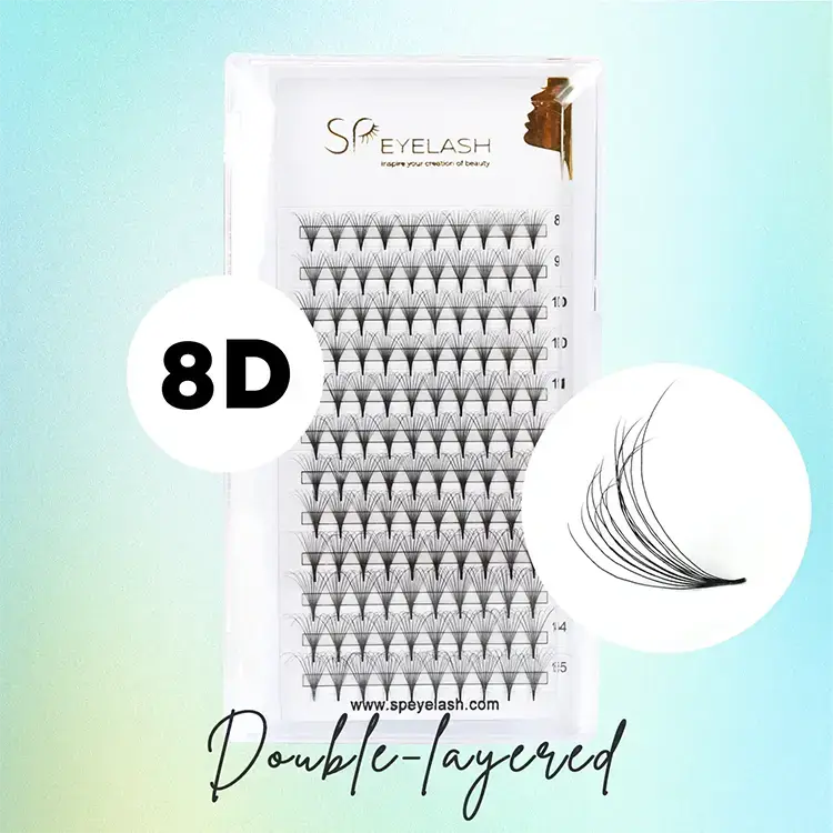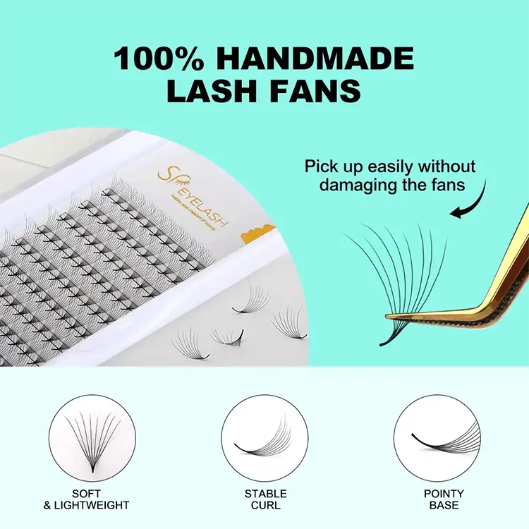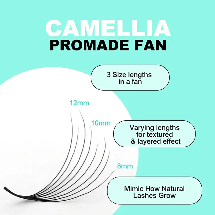 8D Double Camellia Promade Fan Lashes Menggunakan rambut sintetis PBT yang diimpor dari Korea Selatan, yang ringan, lembut, dan memiliki kilau alami. Dibandingkan dengan wol sintetis tradisional, bahan PBT mengurangi berat sekitar 30% dan memiliki tip yang lebih baik. Kipas Camellia Promade semuanya buatan tangan, dengan root yang tipis dan bahkan dan rangkaian bunga simetris.
