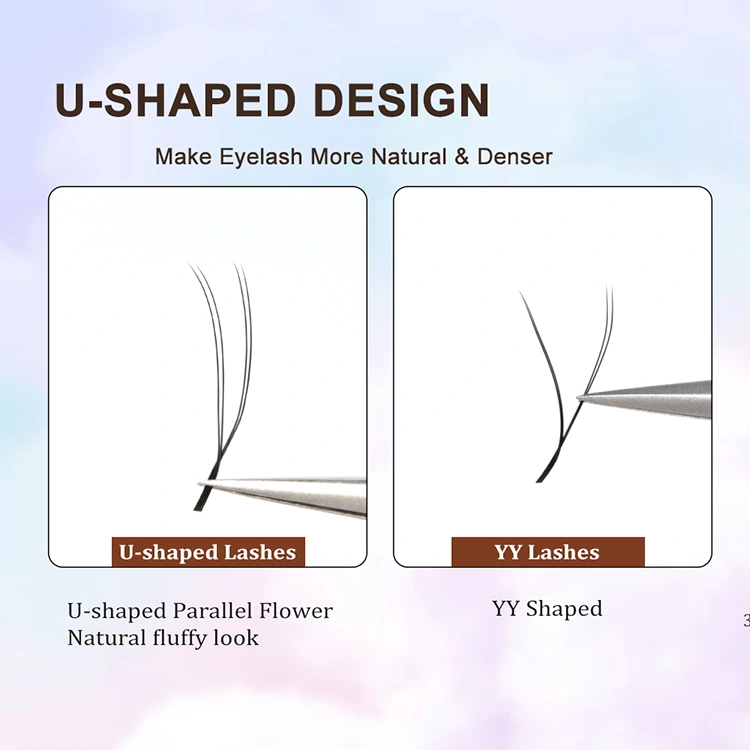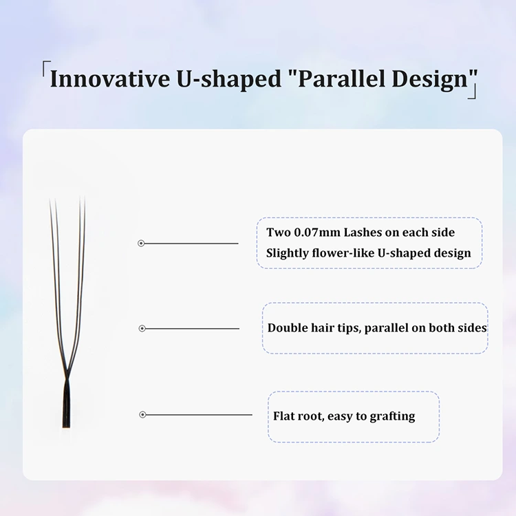 Desain runcing ganda berbentuk U meningkatkan titik kontak perekat, meningkatkan ketegasan dan daya tahan, dan memiliki lebih banyak keunggulan dibandingkan dengan bulu mata berbentuk Y tradisional.